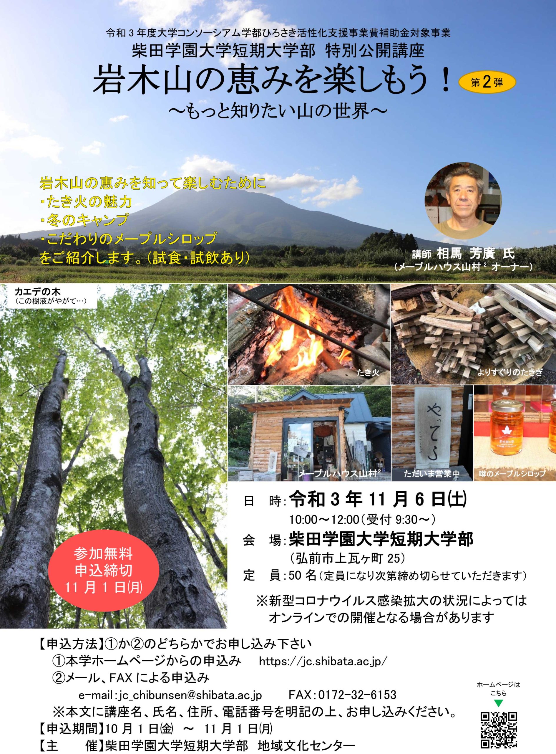特別公開講座を開催いたします! 2021.10.04 イベント 11月6日㈯、特別公開講座『岩木山の恵みを楽しもう!~もっと知りたい山の世界~』を開催いたします。 昨年は「黒文字の魅力」や「山菜の保存方法」をご紹介いただき、大好評でした。第2弾は「焚火の魅力」、「冬のキャンプ」についてご講話いただく予定です。岩木山麓で山暮らしを楽しんでいるメープルハウス山村²オーナーの相馬芳廣氏が熱く語ります。 先着50名様限定です!皆様のご参加をお待ちしております! お申し込みはこちら 投稿ナビゲーション 前の記事柴田学園大学短期大学部 公式Twitter開設いたしました!次の記事株式会社ムジコ・クリエイトとの包括連携協定締結 イベント一覧へ