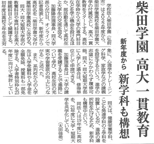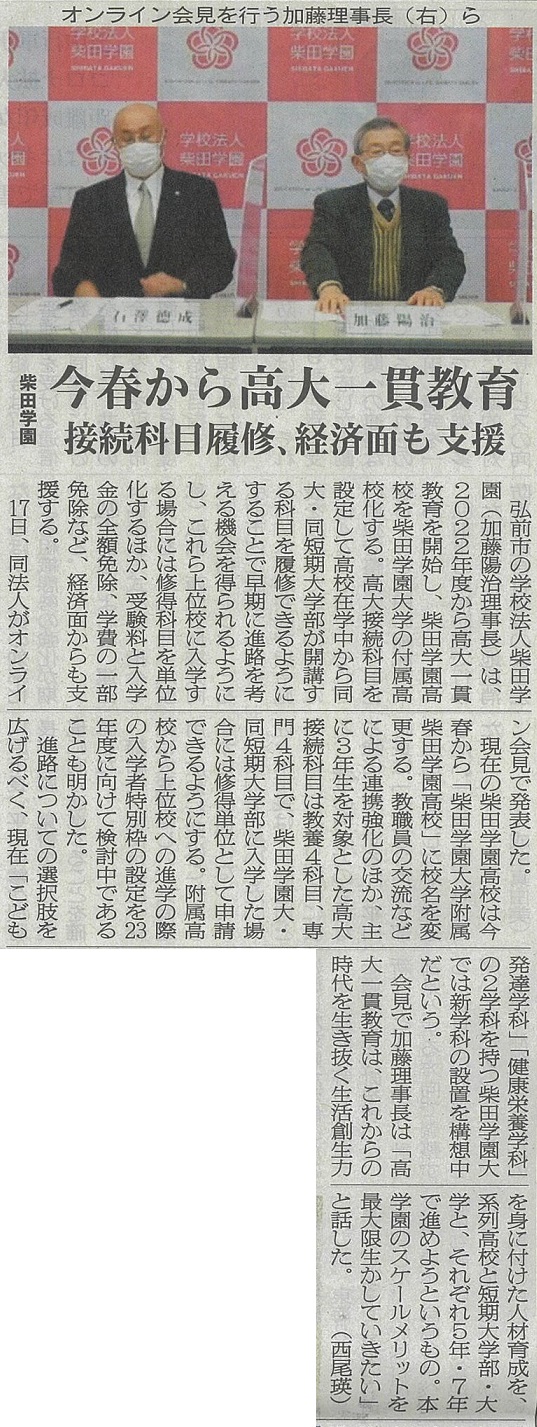柴田学園の高大一貫教育開始が新聞掲載 2022.01.21 メディア掲載 令和4年1月17日(月)にオンライン(zoom)で行われた、2022(令和4)年度から開始する柴⽥学園⾼⼤⼀貫教育についての記者発表が新聞に掲載されました。 陸奥新報社提供 令和4年1月18日「2面」掲載記事 ※この画像は、当該ページに限って陸奥新報の記事利用を許諾したものです。 転載ならびにこのページへのリンクは固くお断りします。 東奥日報社提供 令和4年1月18日「22面」掲載記事 ※この画像は当該ページに限って東奥日報社が利用を許諾したものです。 投稿ナビゲーション 前の記事「第22回 日経STOCKリーグ」に参加しました!次の記事令和4年度 [後期]一般・社会人入学選抜試験 3月1日から願書受付! メディア掲載一覧へ