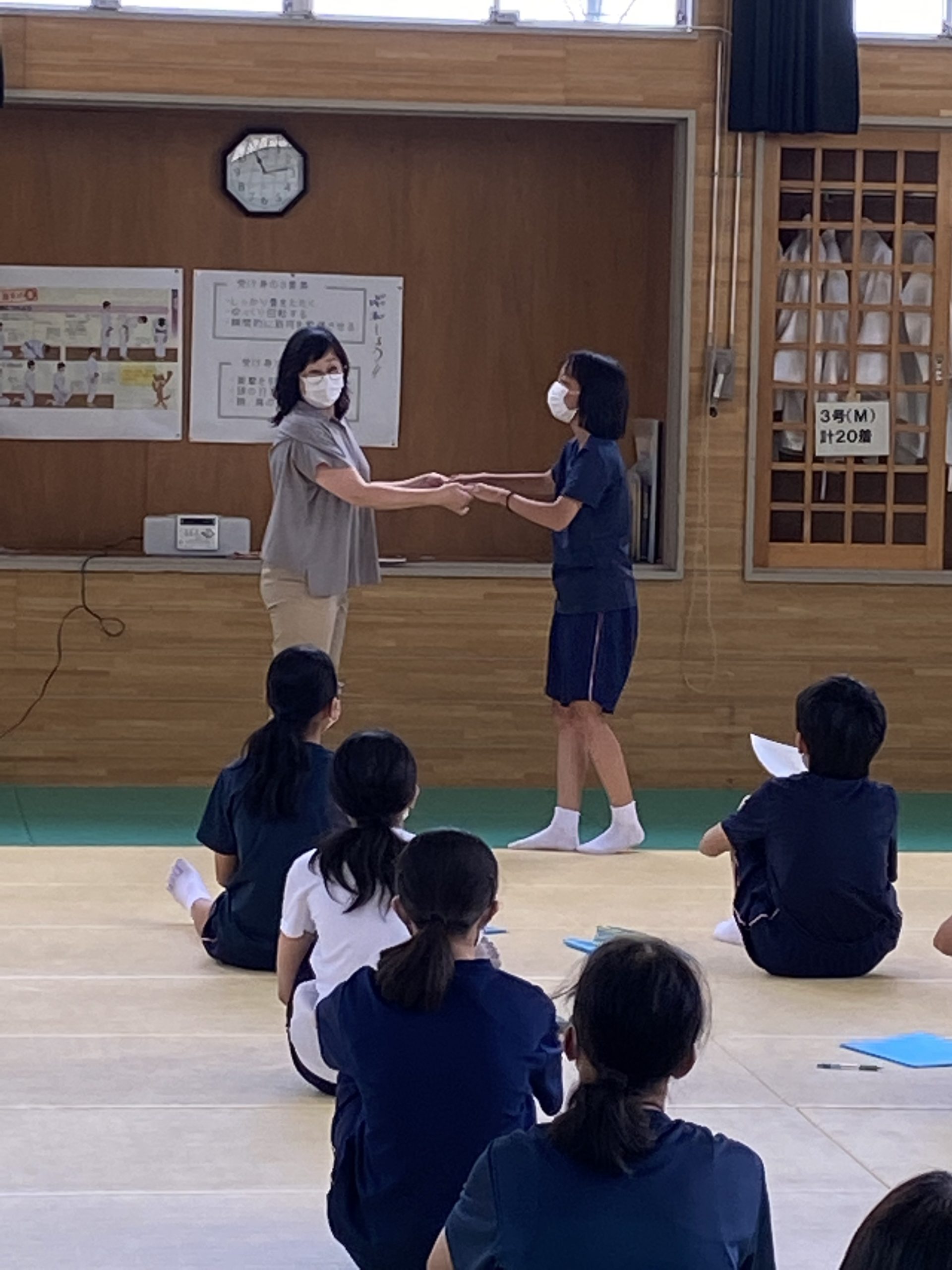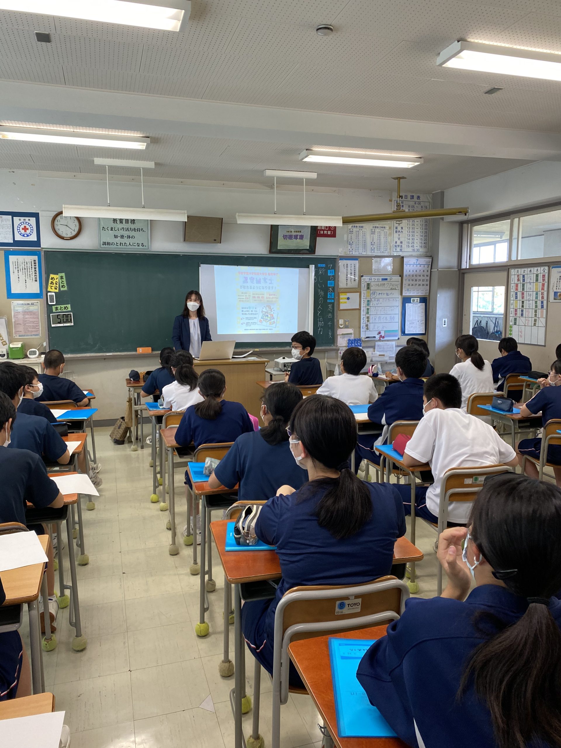 弘前市立北辰中学校へ出張授業に行ってきました! 2022.07.12 イベント 保育科の教員4名が、弘前市立北辰中学校の1年生のみなさんに、出張授業として保育の魅力を伝えてきました。 前半は保育者の仕事や子どもの心理についてクイズも交えてお話しし、後半はわらべ歌と運動遊びを一緒に楽しみました。 「将来は保育の道もなかなかいいかも!」と思ってもらえたら、うれしい限りです。 今和香子先生の授業:身近な道具を使った運動遊び 江苅川淳子先生の授業:保育の仕事とは?~子供の笑顔が私の元気~ 佐々木美子先生の授業:子どもと一緒に楽しむ~わらべ歌遊び~ 投稿ナビゲーション 前の記事今和香子先生 青森県民スポーツ・レクリエーション祭のマスターズ陸上競技で第1位!次の記事「手作りおもちゃコンテスト」最終審査に勝ち残りました! イベント一覧へ