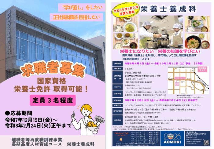 令和7年12月19日(金)~令和8年2月24日(火)正午までの期間で、”栄養士資格”を取得できる「栄養士養成科」の令和8年度4月入学受講生の募集を行っております。(※2年間の訓練コースです)