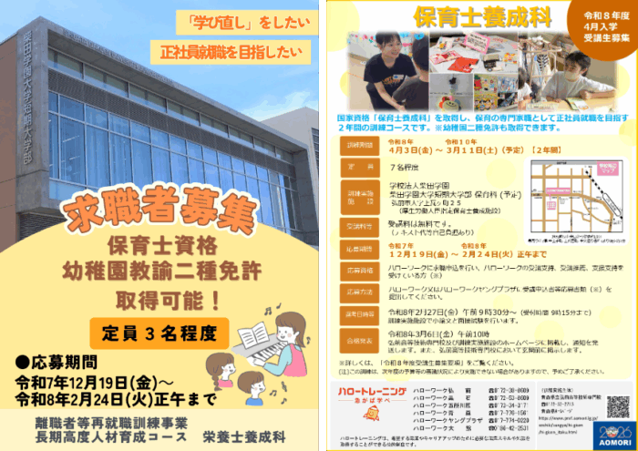 令和7年12月19日(金)~令和8年2月24日(火)正午までの期間で、”保育士資格”を取得できる「保育士養成科」の令和8年度4月入学受講生の募集を行います。(※2年間の訓練コースです)